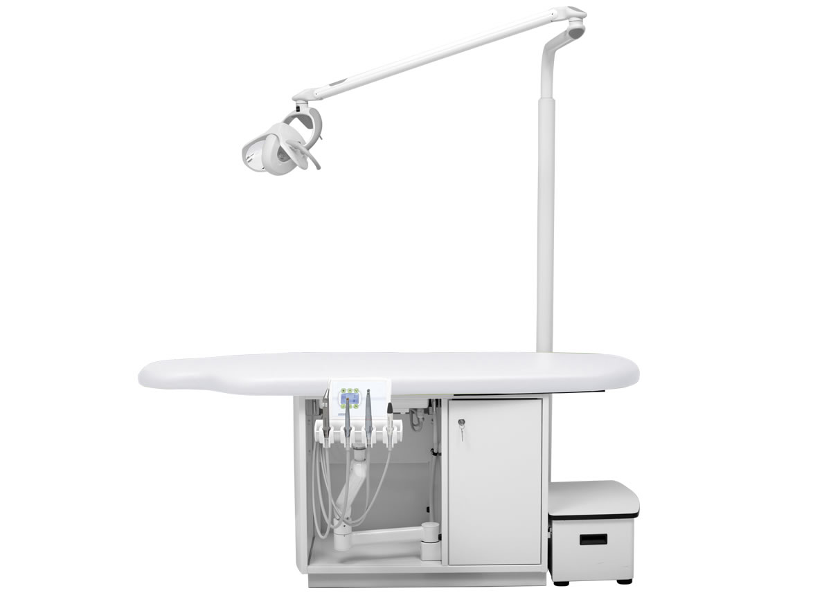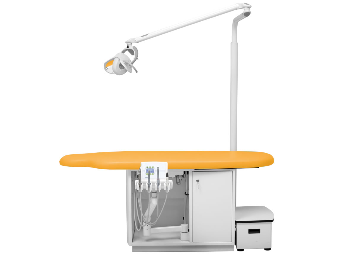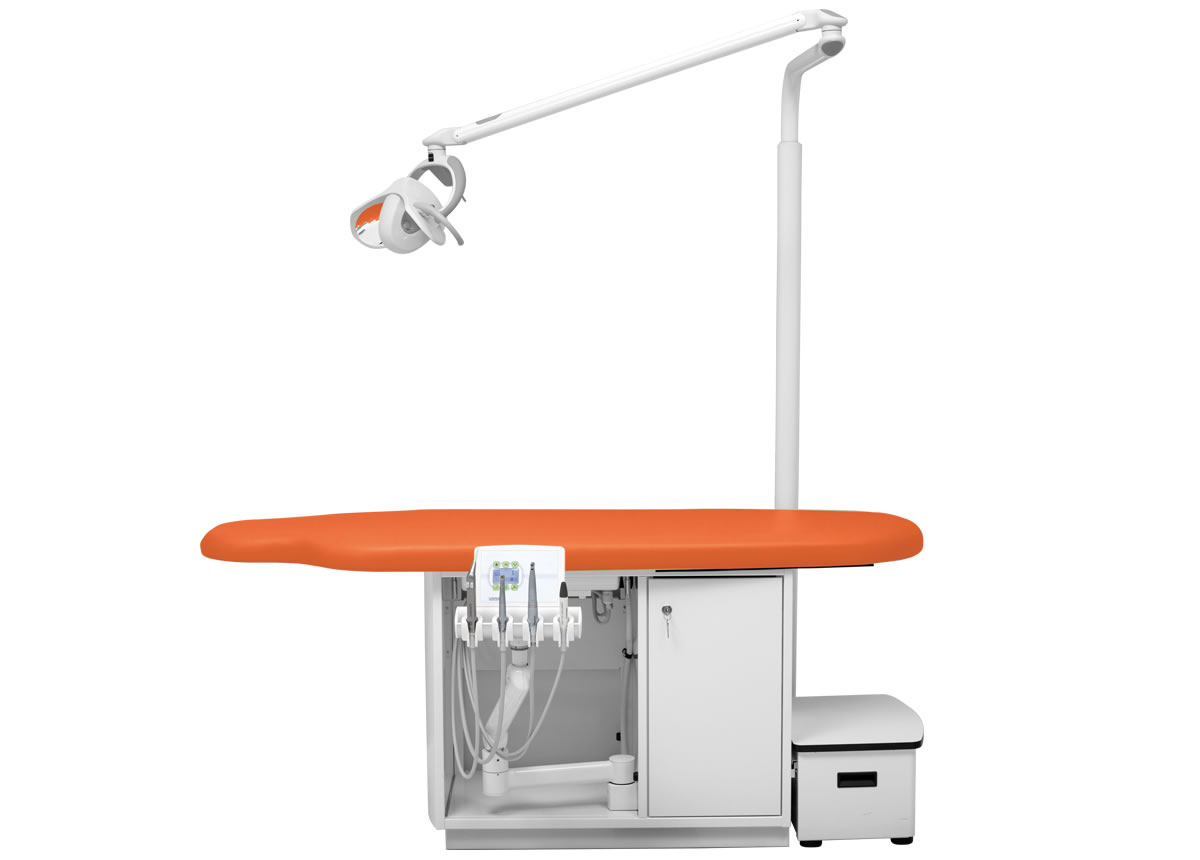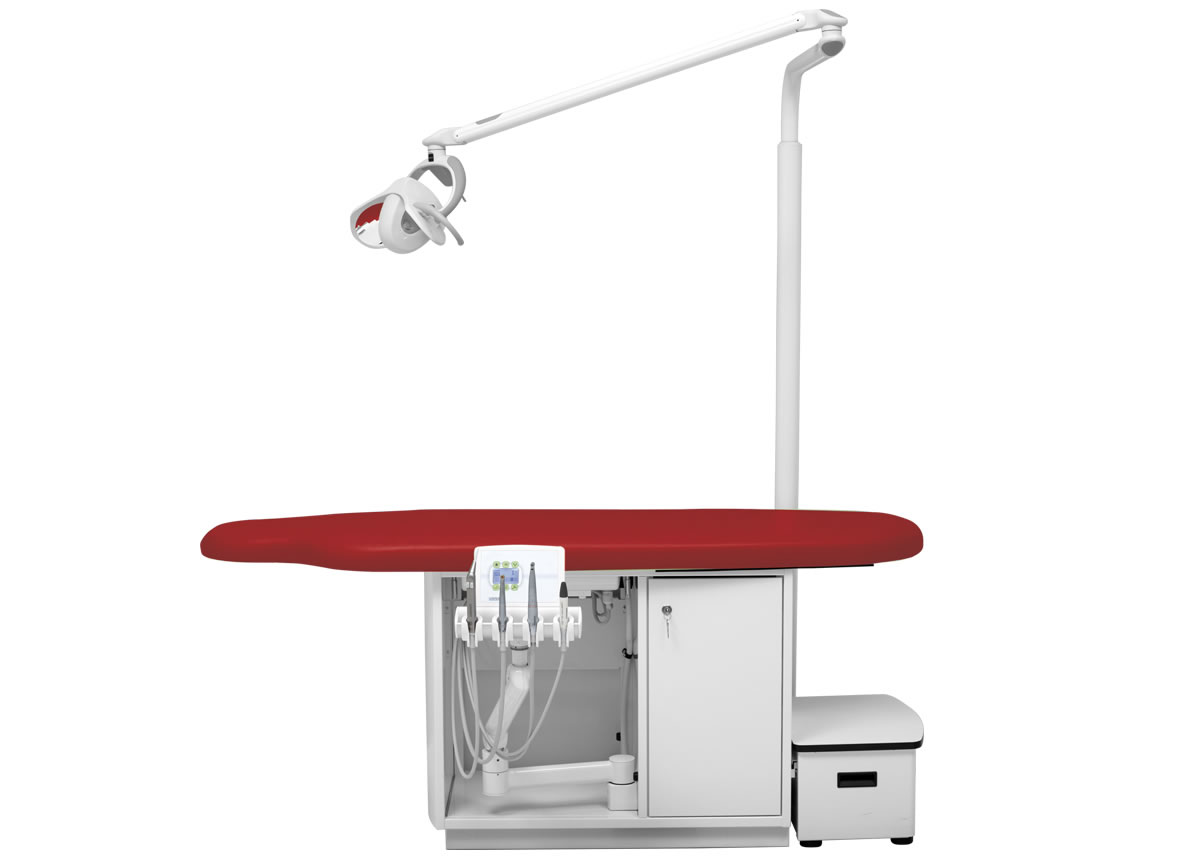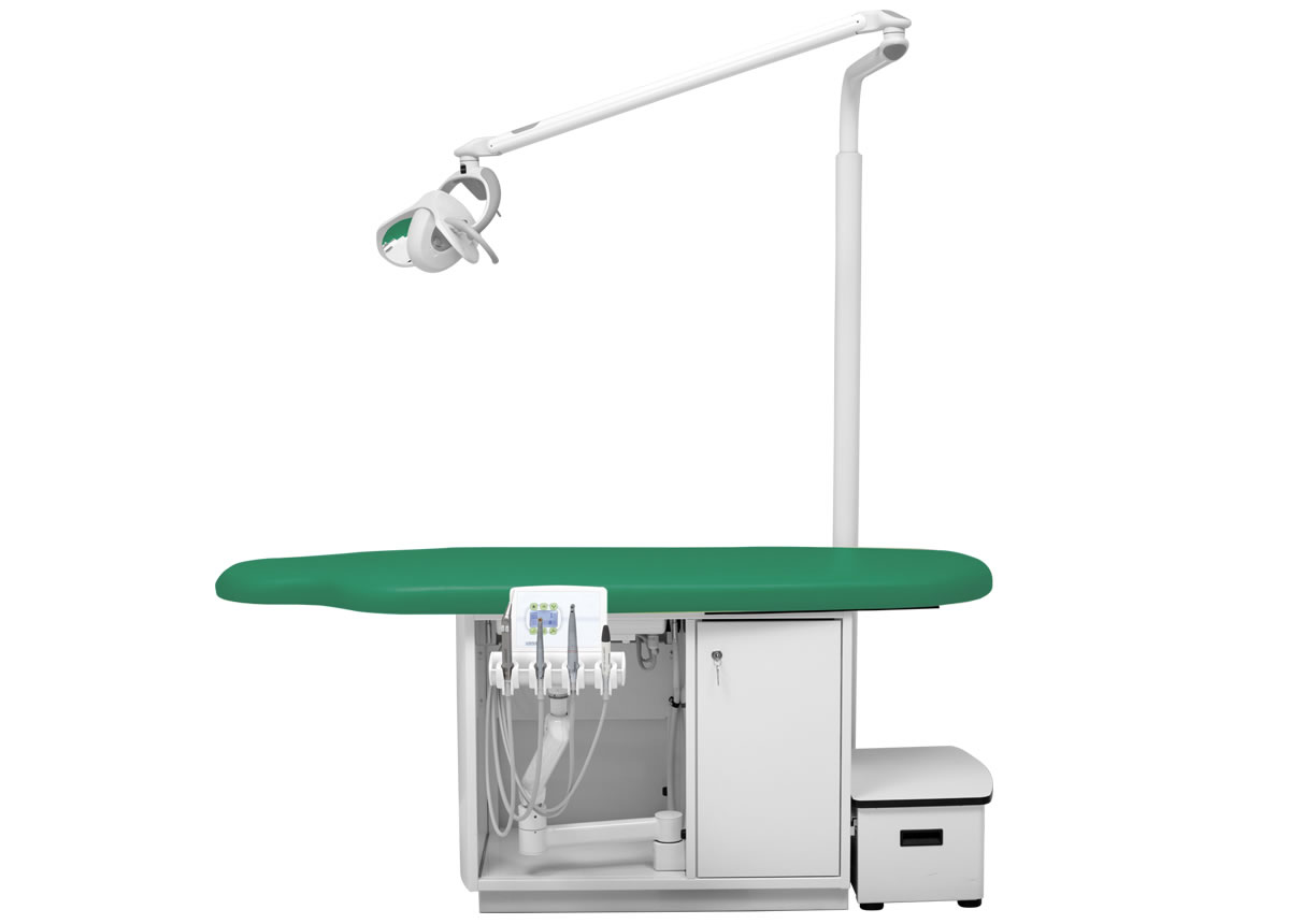 Höhenverstellbares Arztelement, Säulenträger für Leuchte, Digital-Anzeige, alle Funktionen werden über den Fußanlasser gesteuert bzw. abgerufen. Spraywasserheizung im Gerätekörper, Sprayeinrichtung für alle Antriebe rücksaugfrei, Spanbläsereinrichtung für alle Turbinen- und Motoreinrichtungen, 4 Ablageköcher, zentrale Lichtversorgung für Antriebe. Polsterlänge 170 cm. Mit abnehmbarem Treppenelement.