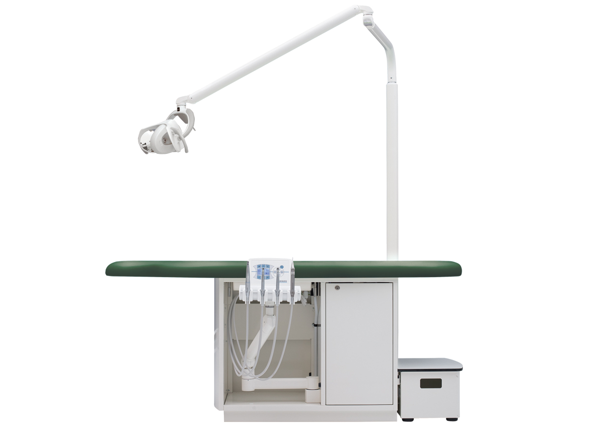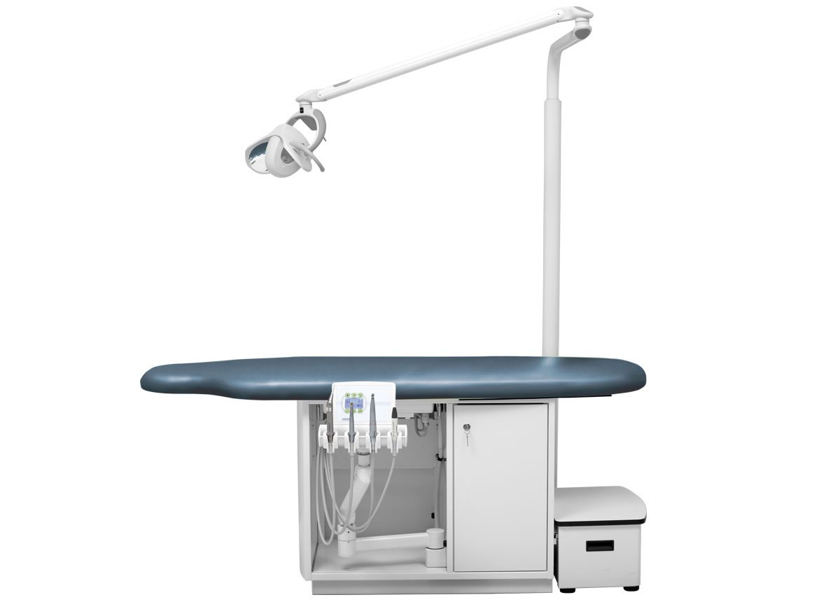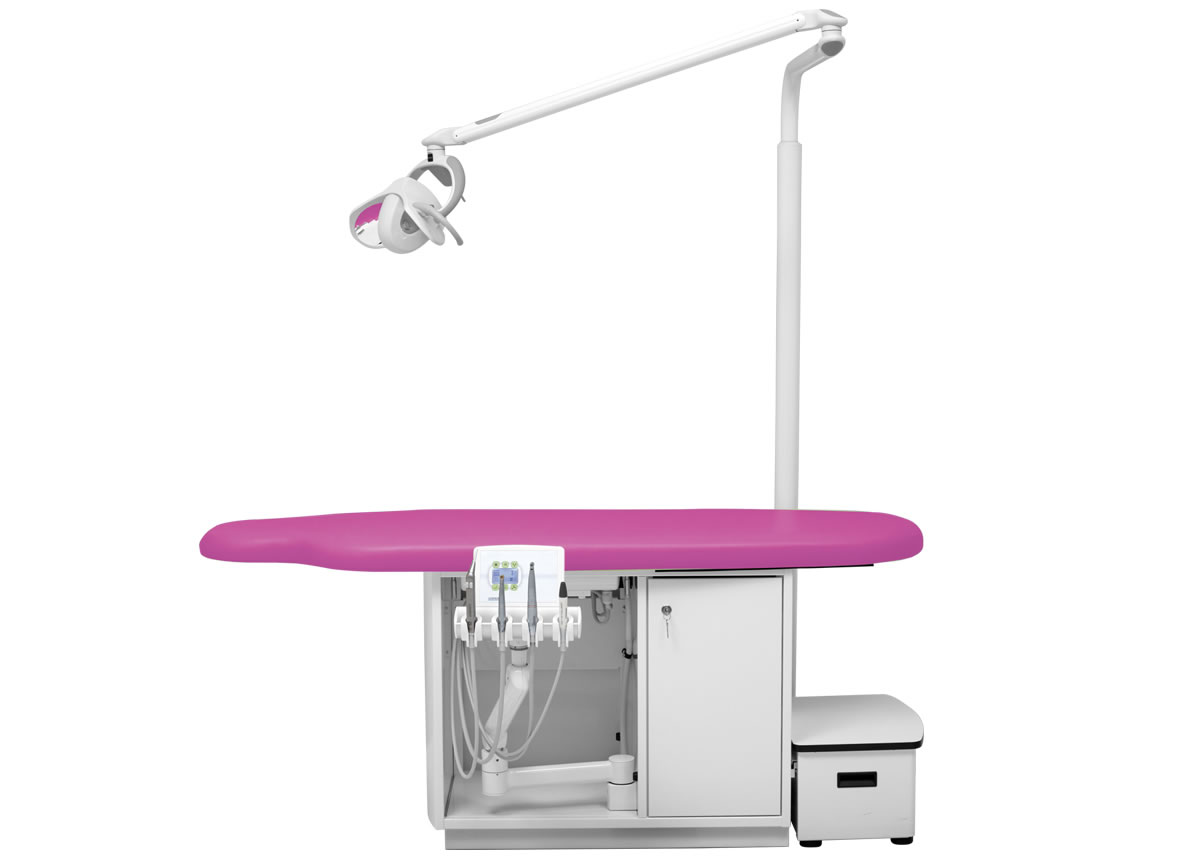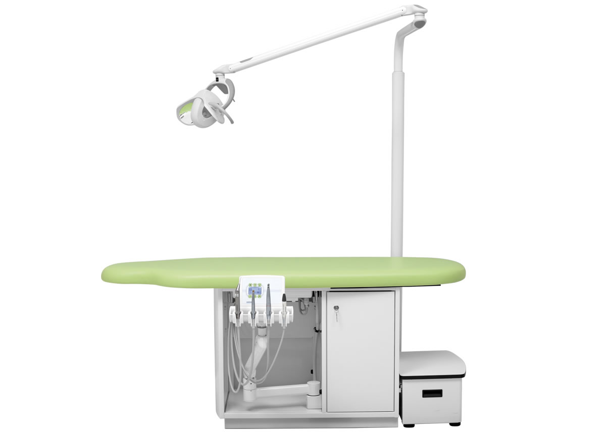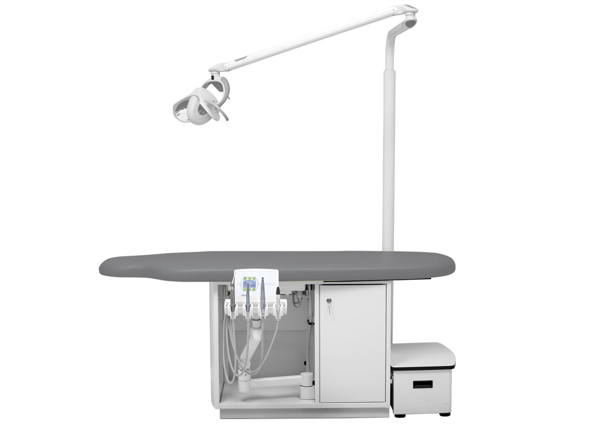 Höhenverstellbares Arztelement, Säulenträger für Leuchte, Digital-Anzeige, alle Funktionen werden über den Fußanlasser gesteuert bzw. abgerufen. Spraywasserheizung im Gerätekörper, Sprayeinrichtung für alle Antriebe rücksaugfrei, Spanbläsereinrichtung für alle Turbinen- und Motoreinrichtungen, 4 Ablageköcher, zentrale Lichtversorgung für Antriebe. Polsterlänge 170 cm. Mit abnehmbarem Treppenelement.