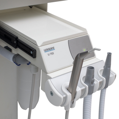 Ausziehbares Assistenzelement mit Ablagemöglichkeit für 1 Normtray, Auszugslänge ca. 300 mm, Instrumentenablage (3 sterilisierbare Köcher) inkl. großem und kleinem Saugschlauch. Auf 5 Köcher erweiterbar.